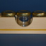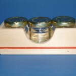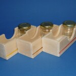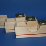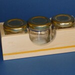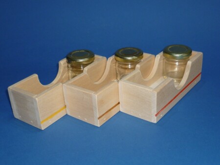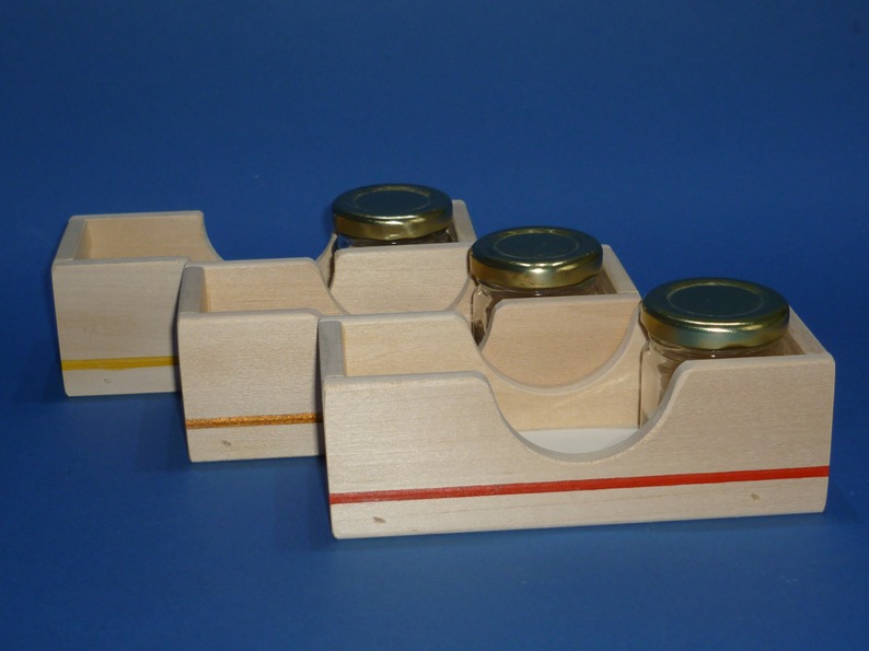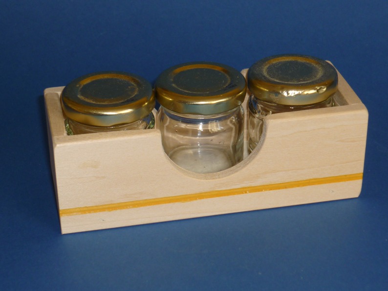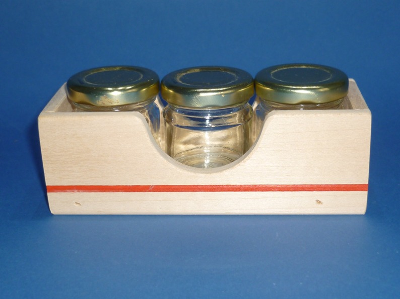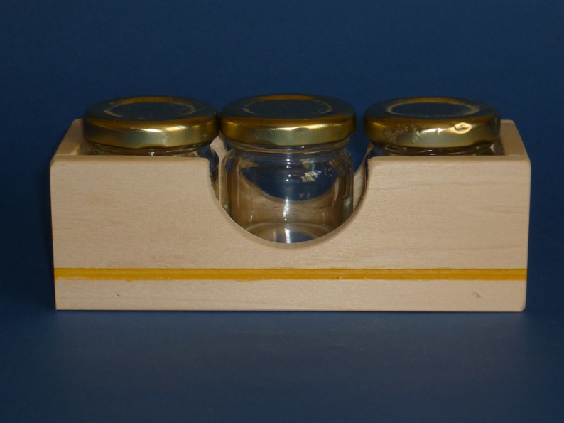 Il porta barattoli è costruito da due materiali, base in multistrato di pioppo e legno di tiglio, contiene 3 barattolini di miele / maarmellate da grammi 40 /50. Le dimensioni possono variare in base al barattolino di miele / confetture, il prezzo non varia. La sua caratteristica è la forma e la linea inferiore colorata, ( su richiesta di colore a Vs piacere : giallo rosso, verde, blu, noce chiaro, castagno, nero, oro, etc oppuer senza linea ) viene venduto al naturale. Smussato in tutti i suoi lati ed angoli, bello al tatto e funzionale.