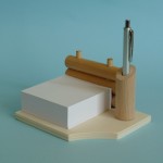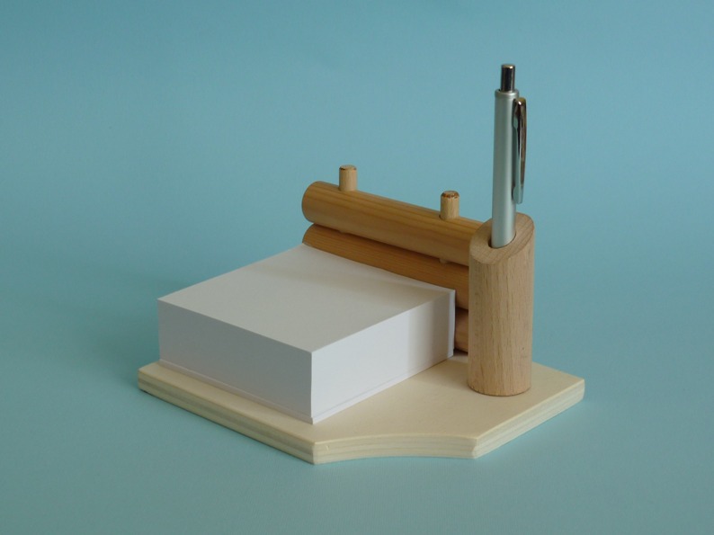 Il porta blocco carta è costruito di due tipi di legno, la base in multistrato di pioppo,il portapenne e lo “steccato” sono in legno di abete,tutti gli angoli e lati sono smussati.