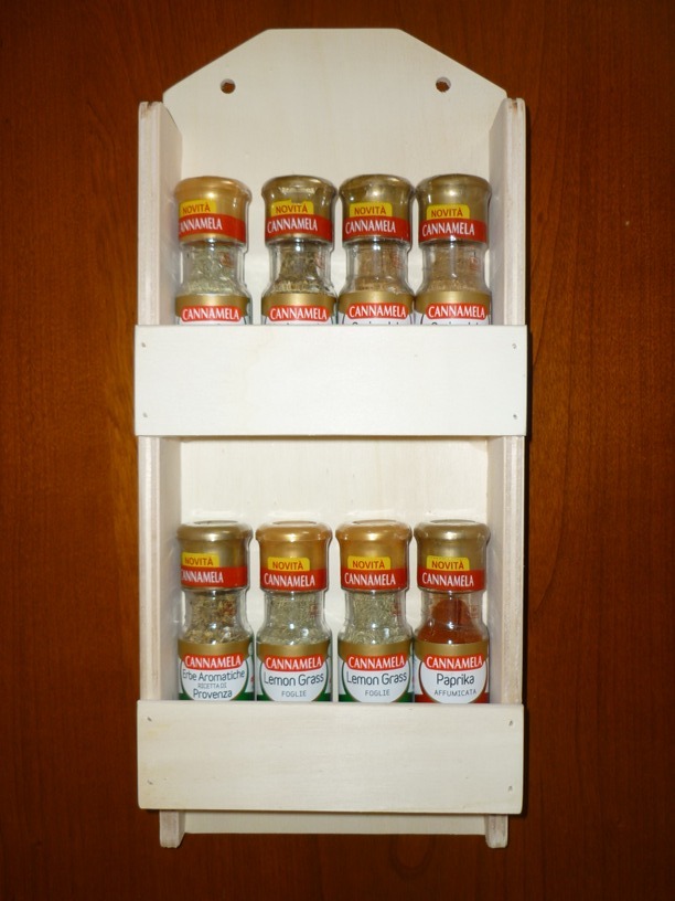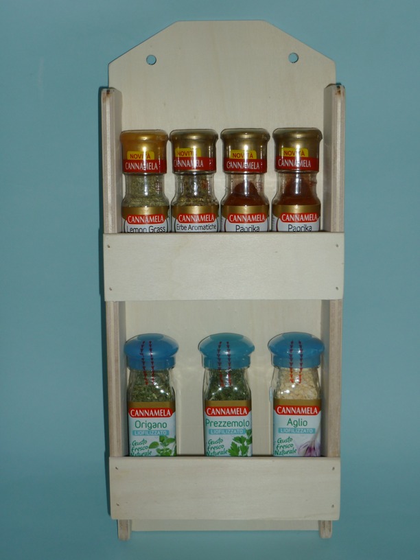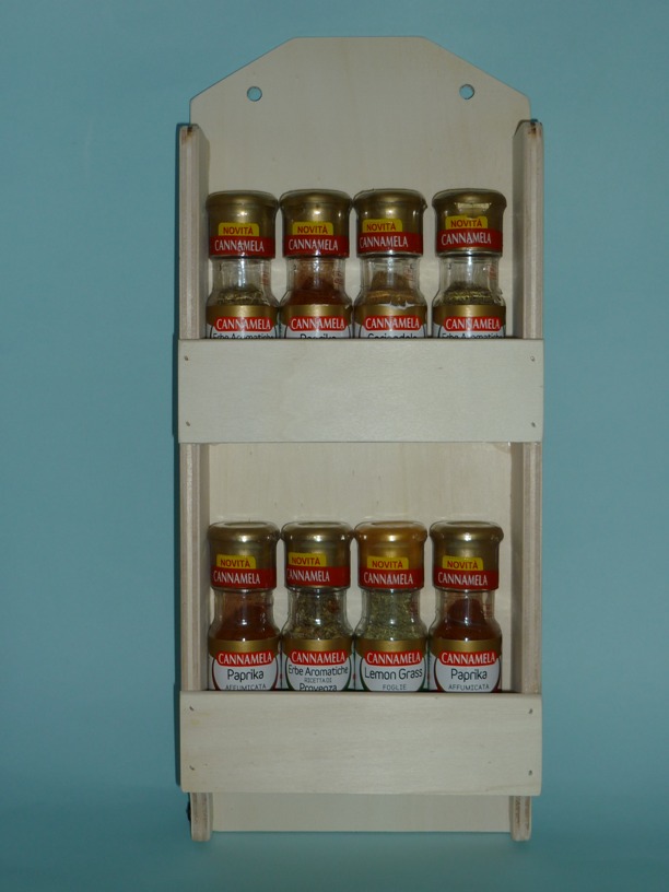 Il portaspezie cod. ”260812” è costruito in legno di multistrato di pioppo, recuperato da scarti di lavorazione al 100%.  Contiene 8 barattoli di spezie (non inclusi). Il portaspezie è smussato su tutti i suoi lati. Viene venduto al grezzo (naturale). E’ un’ottima soluzione per gli appassionati di decoupage, che possono personalizzarlo a piacere. Questo articolo, come tutti gli altri che trovate sul sito, viene prodotto in Italia “made in Italy