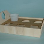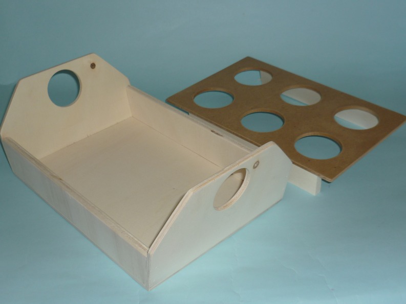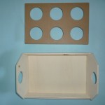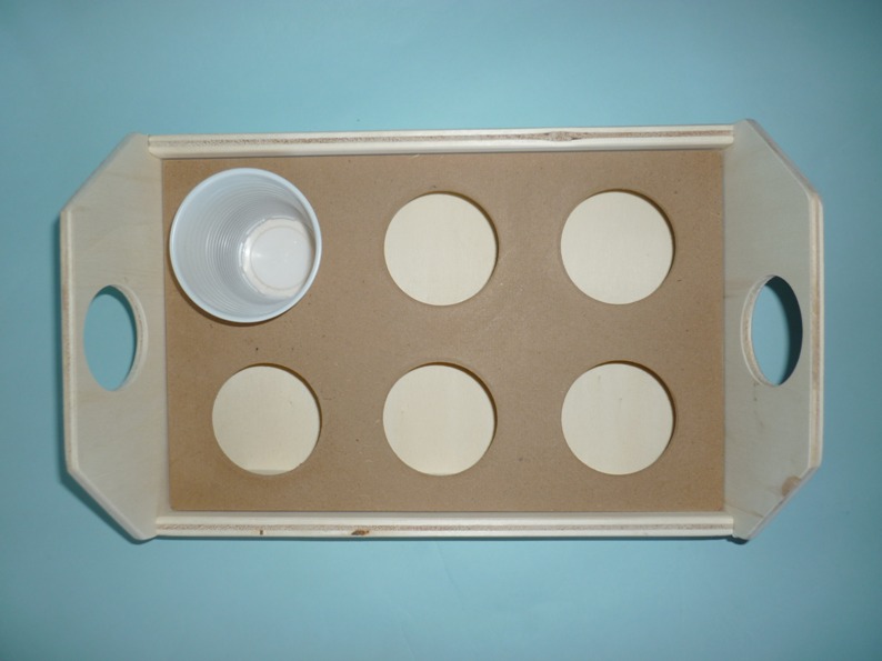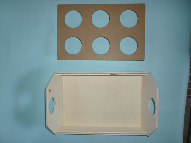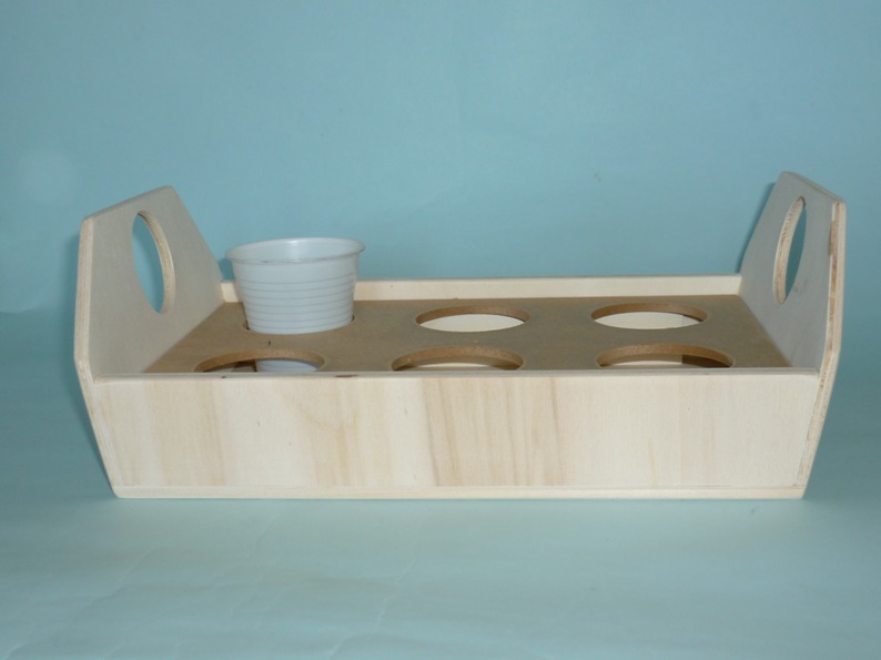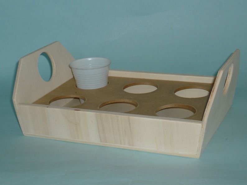 Il vassoio porta bicchieri è costruito di due tipi di legno, di multistrato di pioppo e il divisorio porta bicchieri in mdf,può essere usato anche come vassoio levando la parte interna, smussato in tutti i lati e fori,viene venduto al grezzo, pronto per essere decorato a vostro gradimento. Contiene 6 bicchieri in plastica universali.